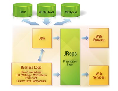 JReps interfaces with databases and business logic components in a uniform manner. All industry standard databases such as Oracle TM , Microsoft SQL Server TM ,